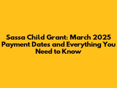 Hey everyone! Are you looking for information about the SASSA Child Grant and when the payments will be made in March 2025? Well, you've come to the right place! This guide is your go-to resource for everything related to the SASSA Child Support Grant, including payment dates, eligibility criteria, how to apply, and some helpful tips and tricks. Let's dive in and get you all the info you need to navigate this process smoothly. Knowing the exact dates for payments can help you plan your finances and ensure you can provide for your kids. This article is designed to give you clarity and peace of mind, so you're always in the loop. We'll cover everything from the basics of the grant to the nitty-gritty details of the March 2025 payments. So, grab a coffee, sit back, and let’s get started. Ensuring that you have the correct information is essential, and we're here to make sure you get just that. We aim to keep you informed and prepared, so you can focus on what matters most: your family. The SASSA Child Grant is a lifeline for many families, and understanding how it works and when payments are made can make a big difference in their lives. We will explore everything you need to know about eligibility, application processes, and the actual payment dates for March 2025. It is our goal to help you navigate this process smoothly and with confidence. This guide will provide you with all the necessary details to stay informed and manage your finances effectively. We know how important it is to keep up-to-date with your grant information, so let's get into the details and make sure you're well-prepared. This comprehensive guide covers all aspects of the SASSA Child Grant, from eligibility requirements and the application process to the specifics of the March 2025 payment schedule. Whether you're a first-time applicant or already receiving the grant, this article is designed to provide you with valuable insights and up-to-date information. Let's get you prepared and informed for the upcoming payments! This guide provides a detailed overview of the SASSA Child Grant and focuses on the March 2025 payment dates. Let’s get you ready and informed!